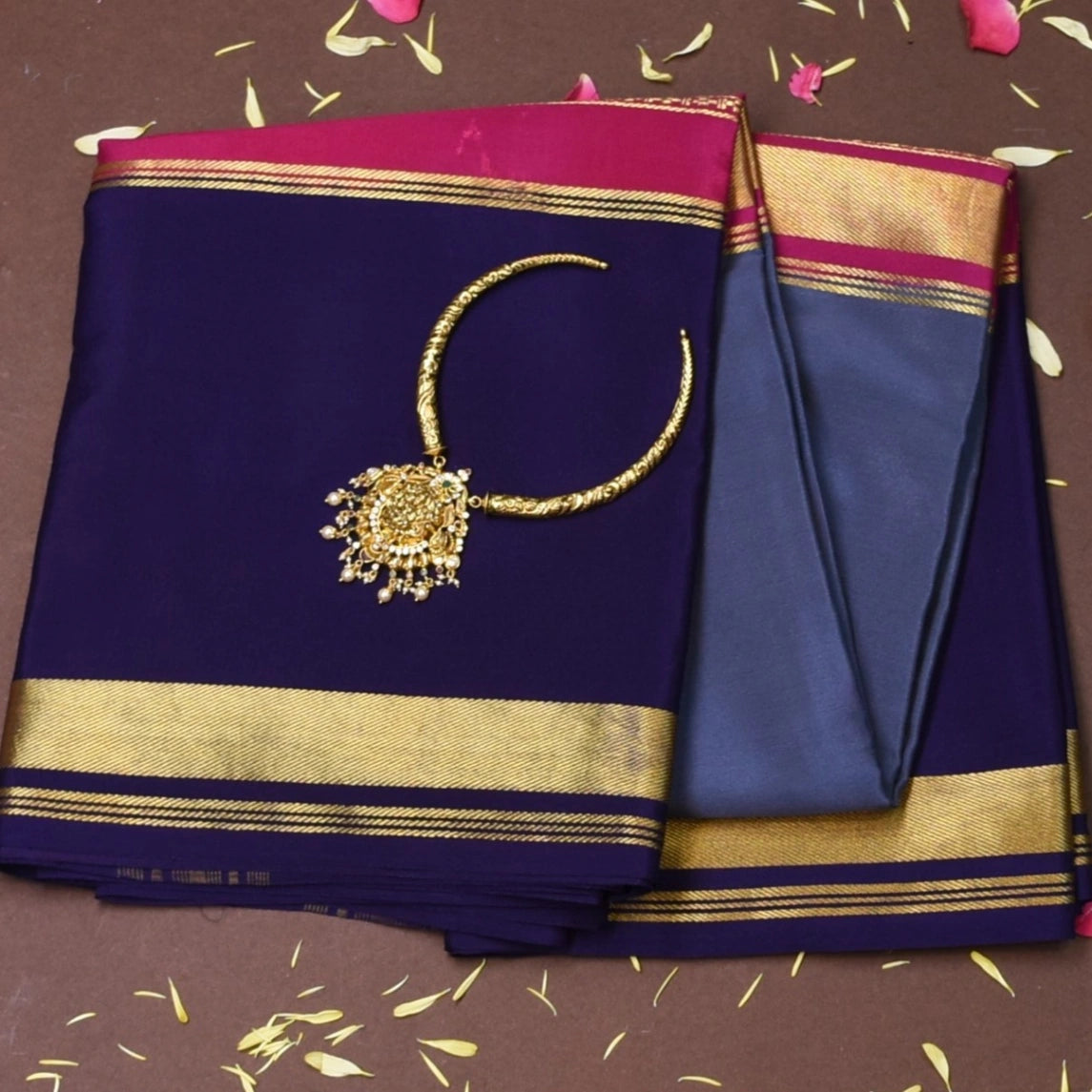 This mysore crepe silk saree in a deep violet shade exudes grace and sophistication. Designed with intricate traditional motifs, it is perfect for weddings, festive celebrations, and cultural events.