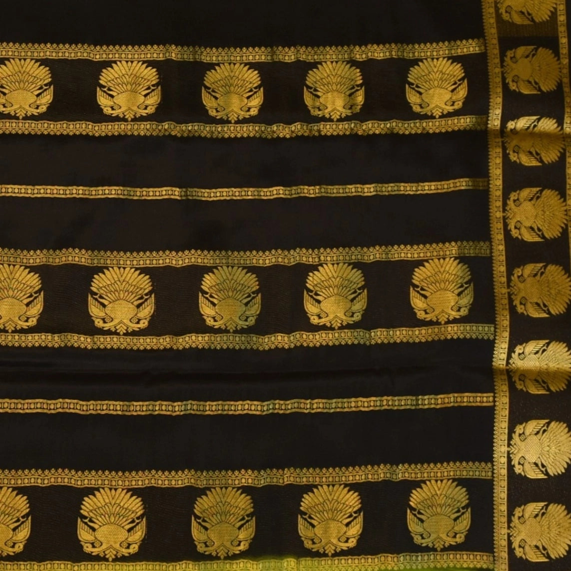 This mysore crepe silk saree in a olive green shade exudes grace and sophistication. Designed with intricate traditional motifs, it is perfect for weddings, festive celebrations, and cultural events.