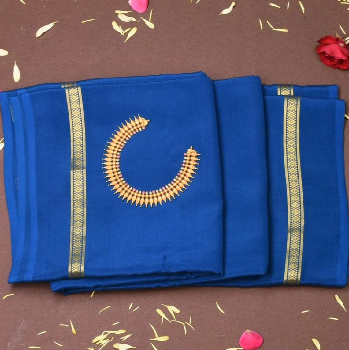 This mysore crepe silk saree in a royal blue shade exudes grace and sophistication. Designed with intricate traditional motifs, it is perfect for weddings, festive celebrations, and cultural events.