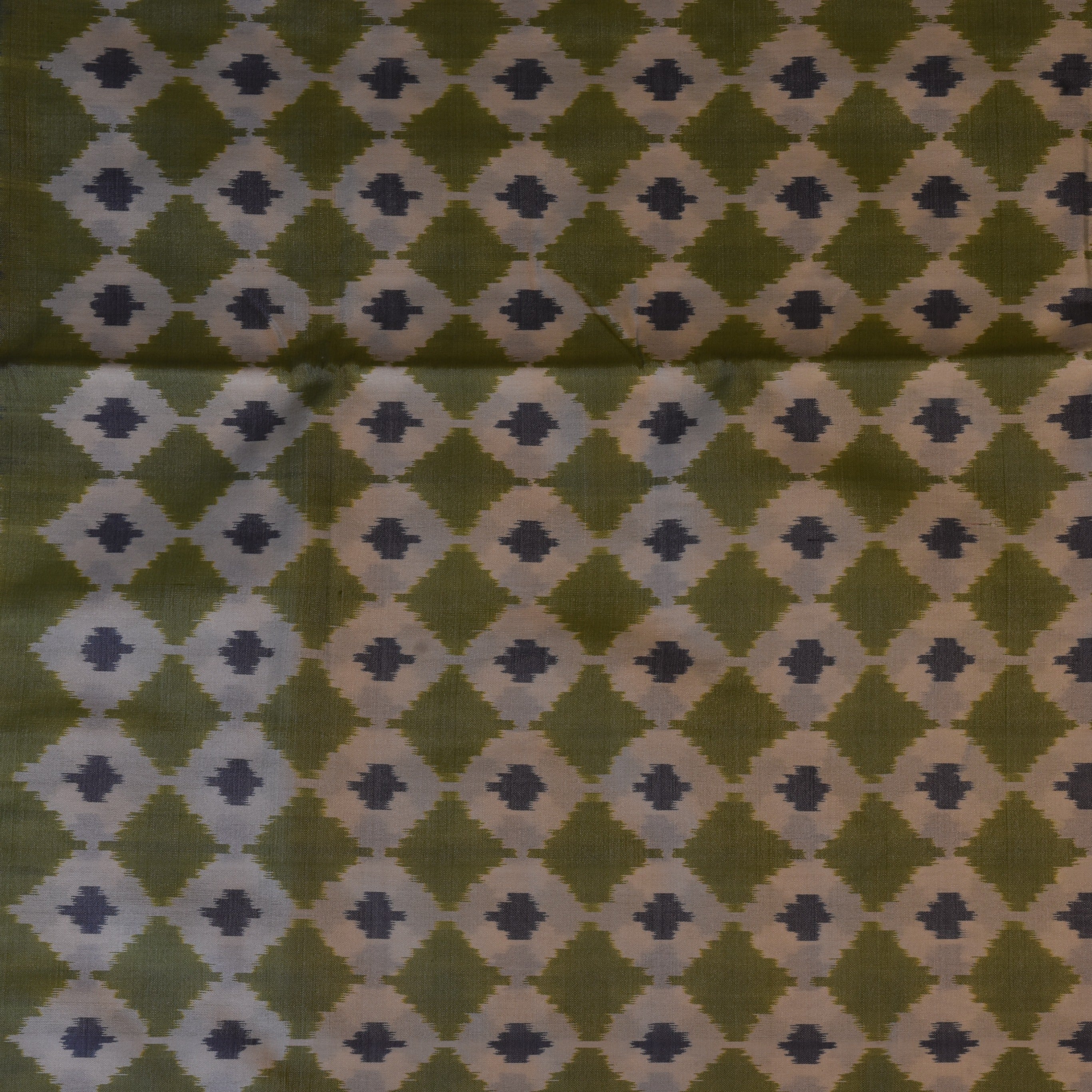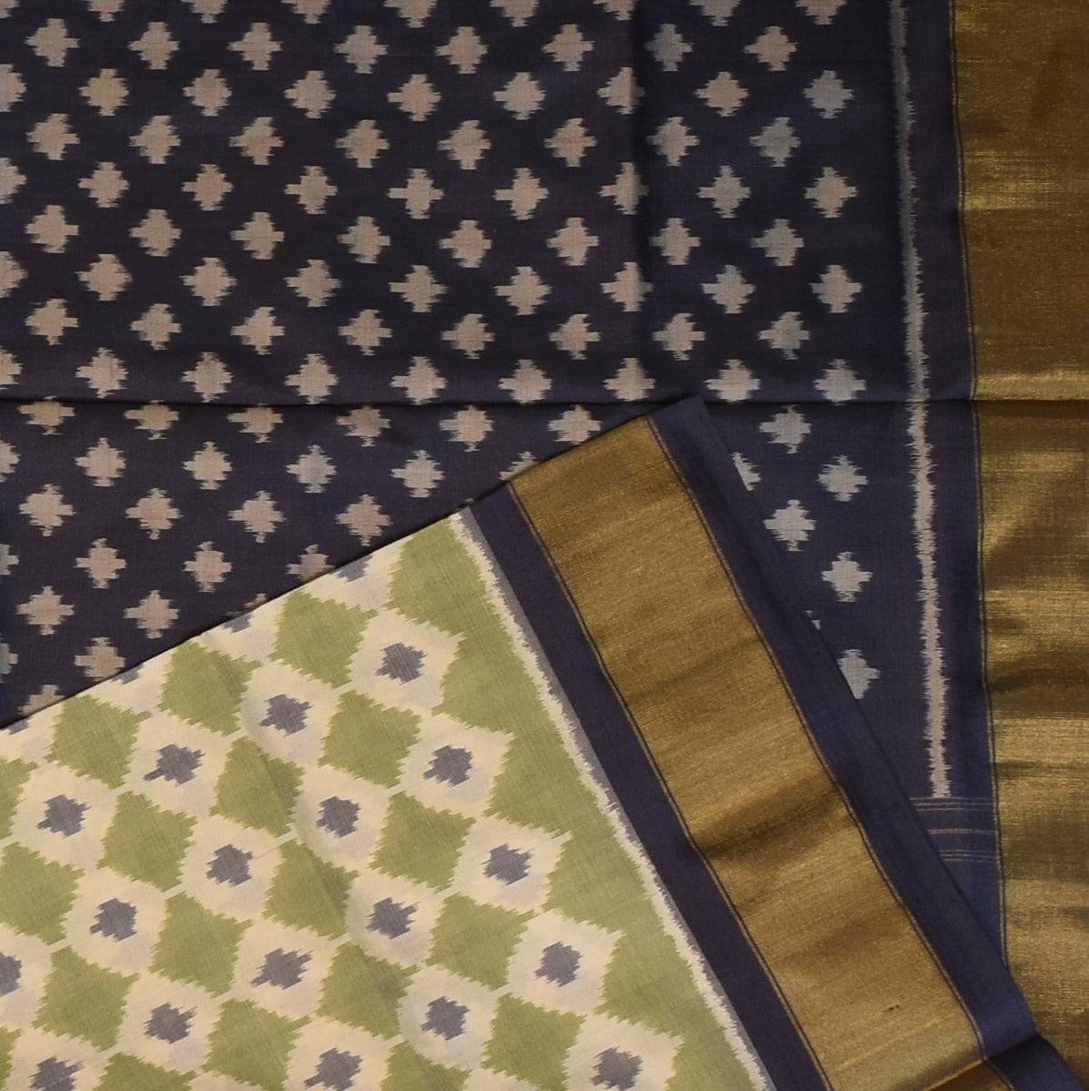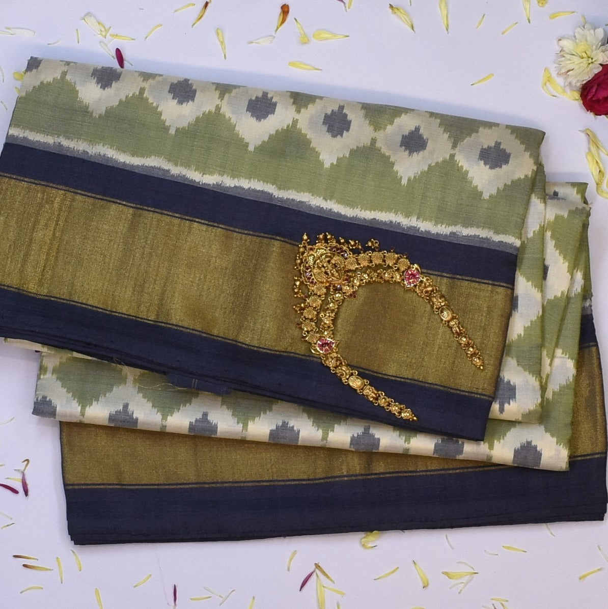 This Pochampally ikkat saree in a ivory and jade green shade exudes grace and sophistication. Designed with intricate traditional motifs, it is perfect for weddings, festive celebrations, and cultural events.