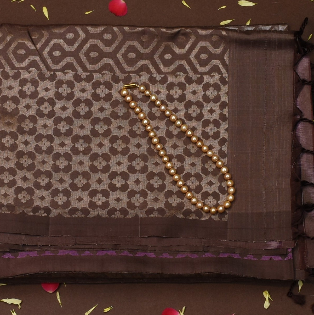 This Pure silk saree in a chocolate brown shade exudes grace and sophistication. Designed with intricate traditional motifs, it is perfect for weddings, festive celebrations, and cultural events.
