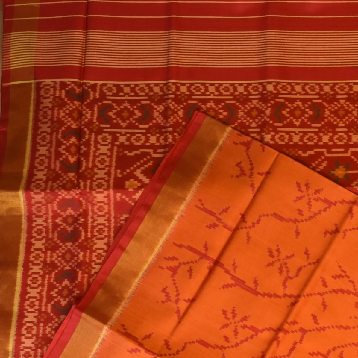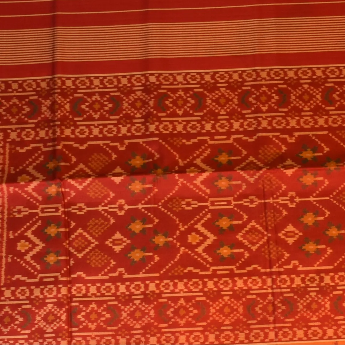 This Rajkot Patola saree in a brick red shade is a perfect blend of tradition and elegance. Its intricate patterns make it an ideal choice for festive occasions, weddings, and cultural events.