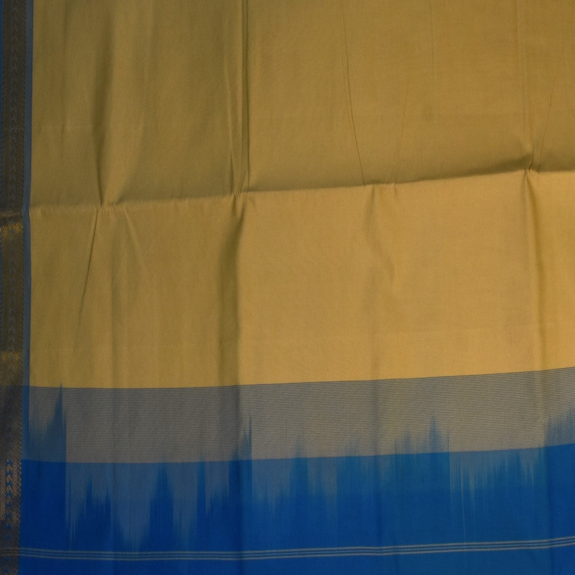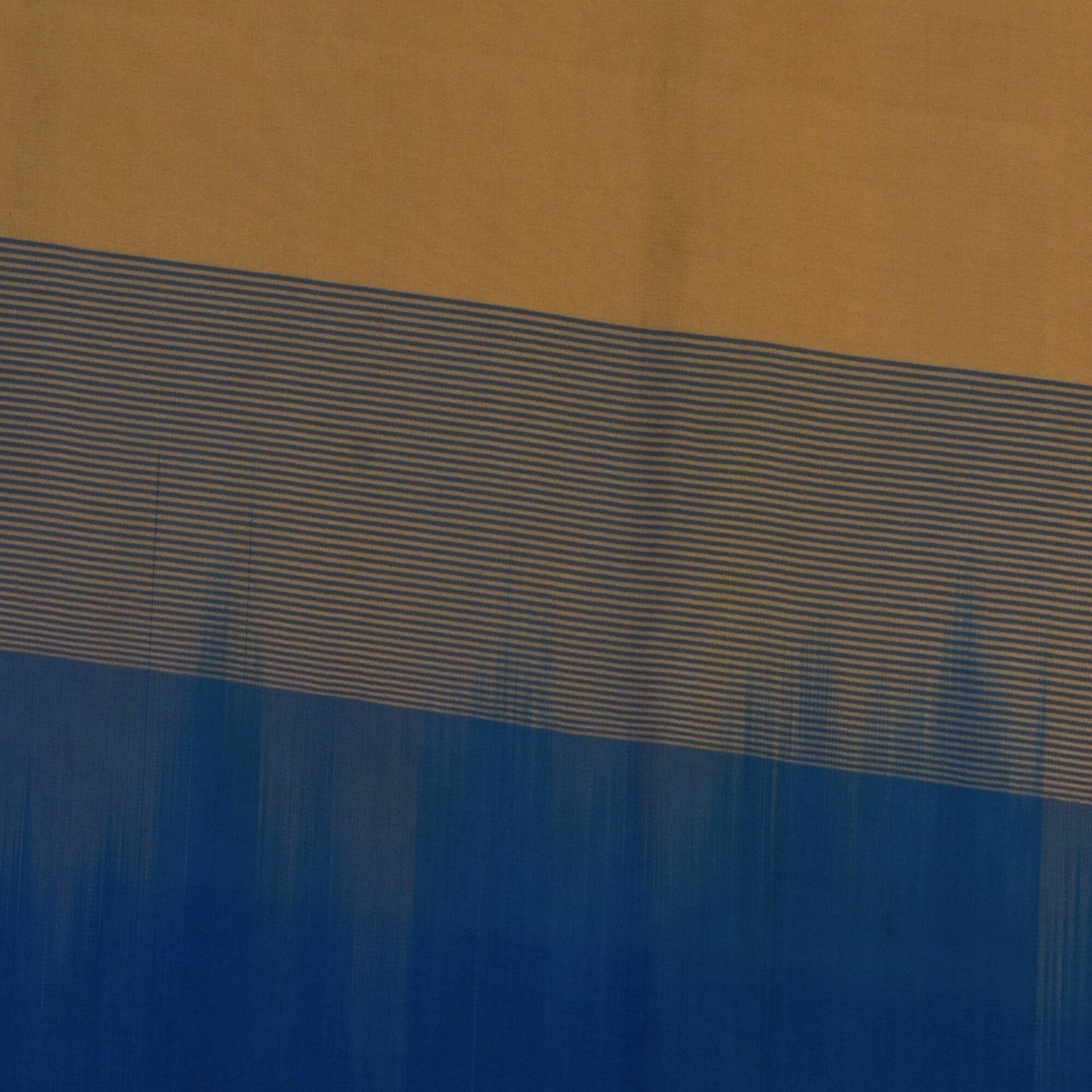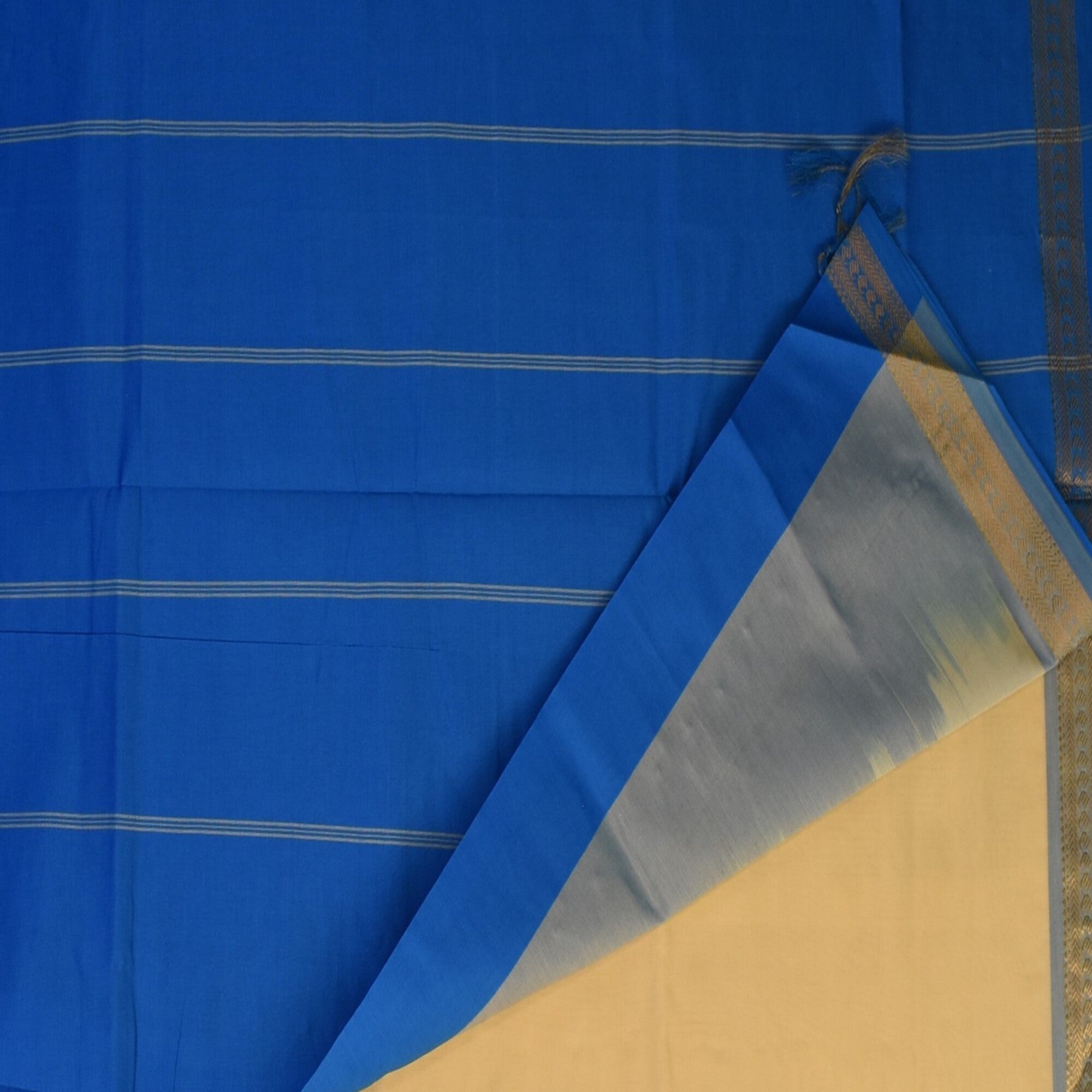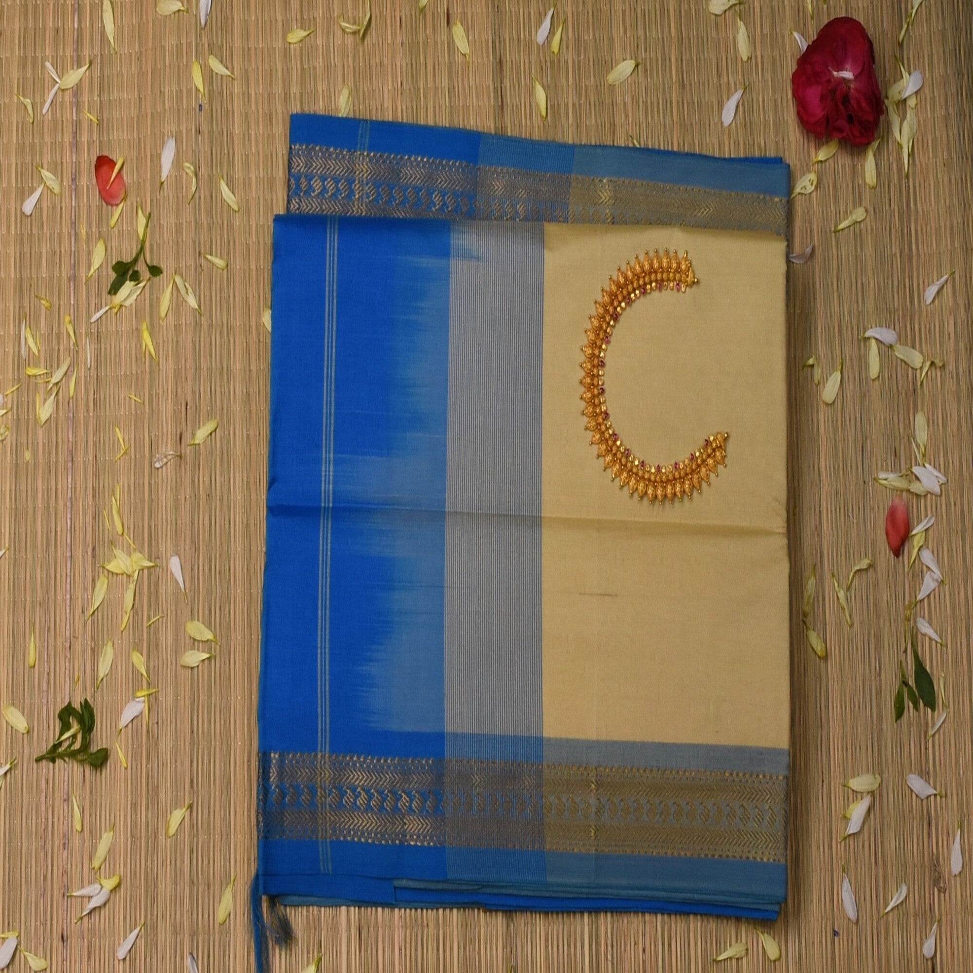This semi cotton beige saree with blue boarder. The fabric breathes effortlessly while retaining a regal texture. This is perfect for pujas, casual wear and graceful day wear.