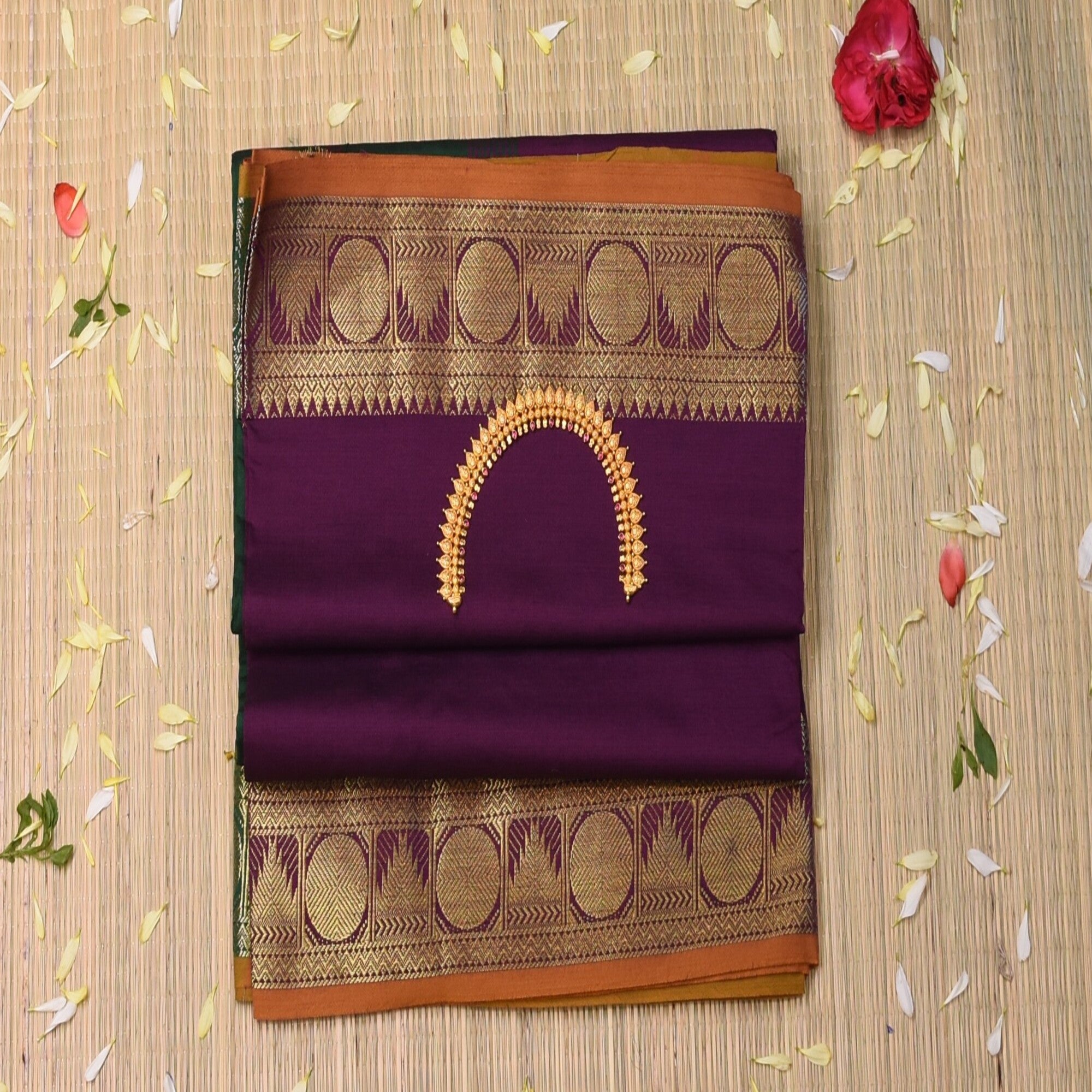 This semi cotton grape wine saree with jari boarder. The fabric breathes effortlessly while retaining a regal texture. This is perfect for pujas, casual wear and graceful day wear.
