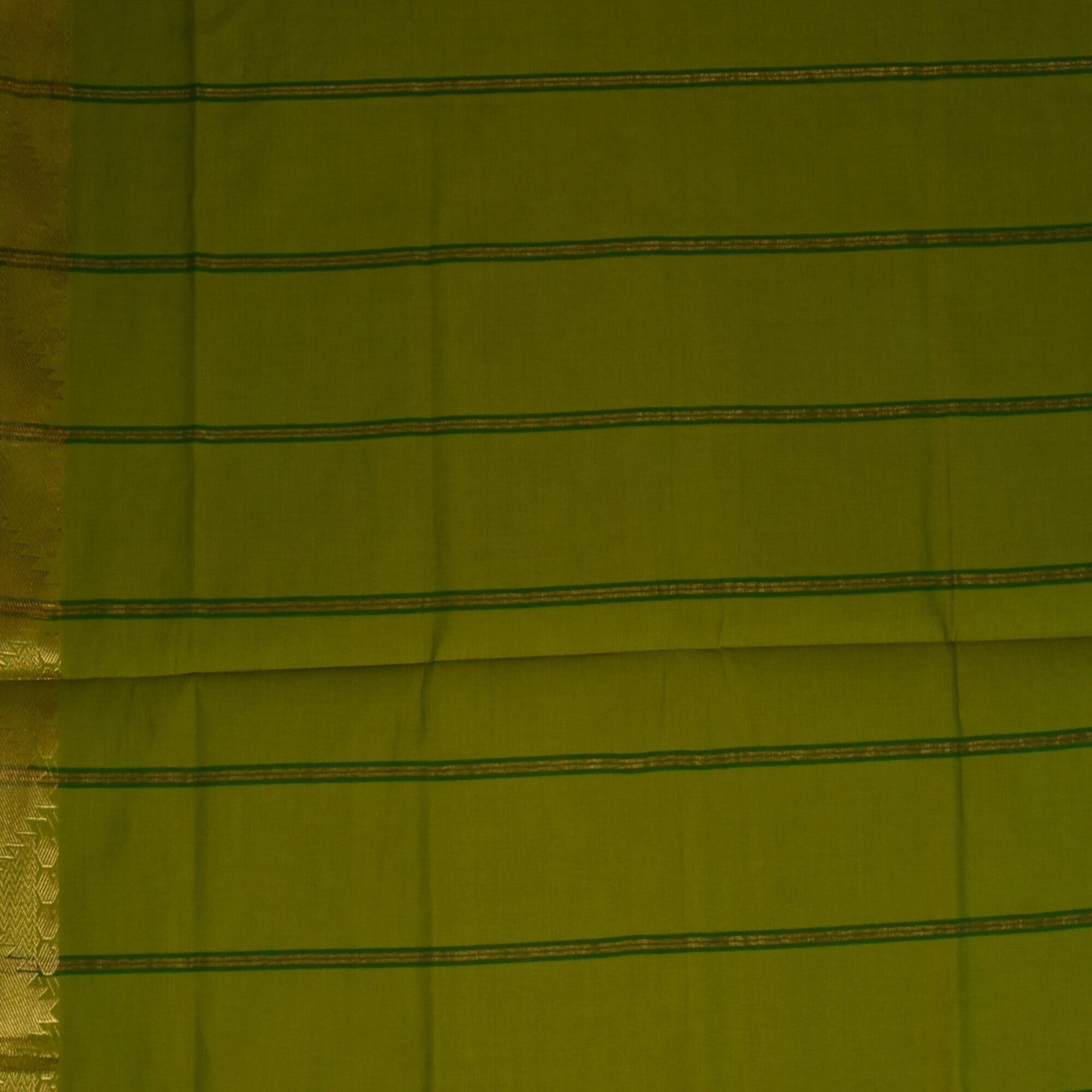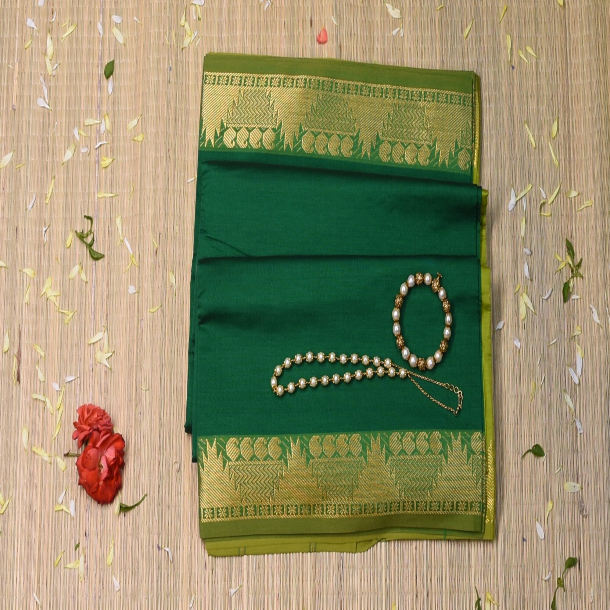 This semi cotton green saree with Jari boarder. The fabric breathes effortlessly while retaining a regal texture. This is perfect for pujas, casual wear and graceful day wear.