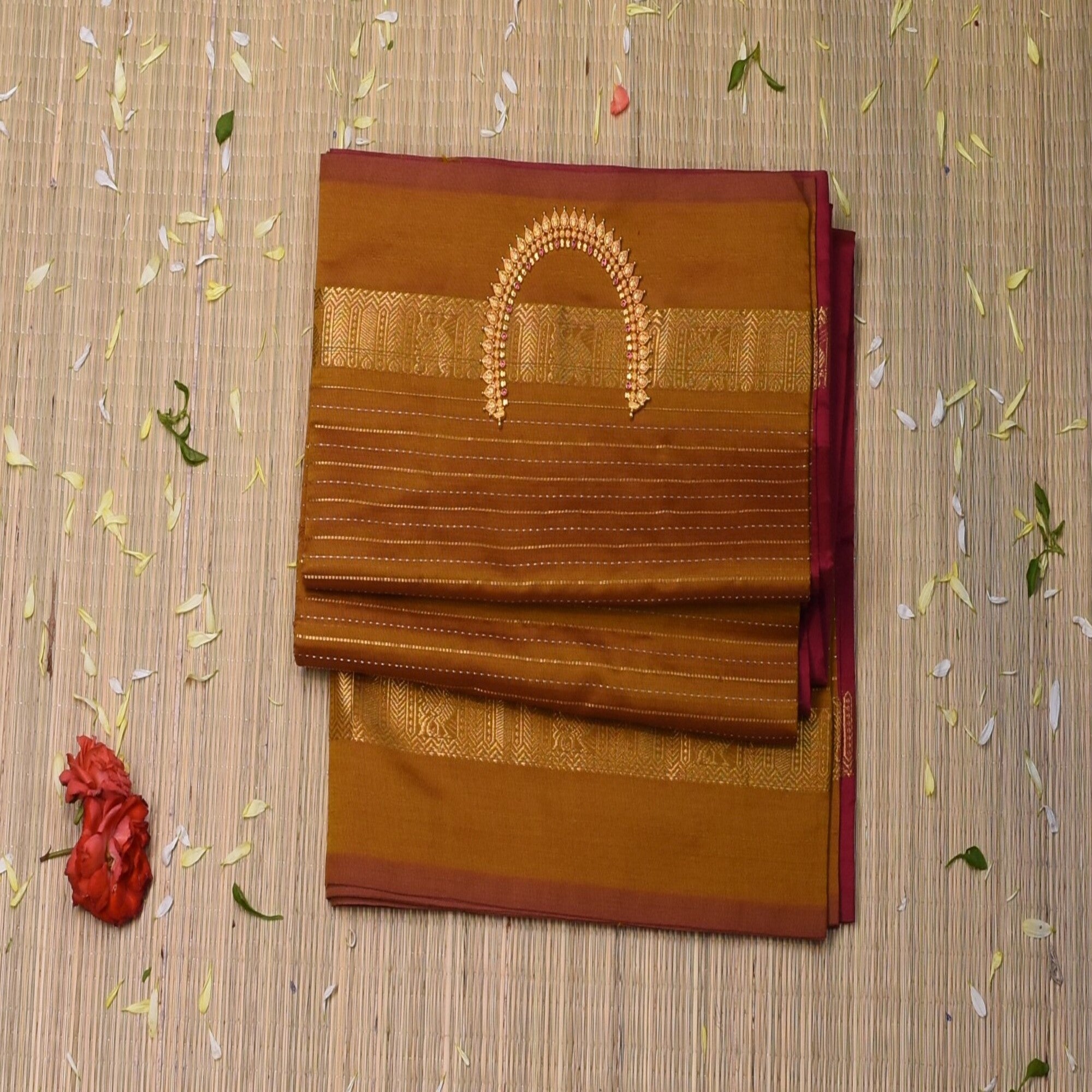 This semi cotton mustard saree with blouse. The fabric breathes effortlessly while retaining a regal texture. This is perfect for pujas, casual wear and graceful day wear.