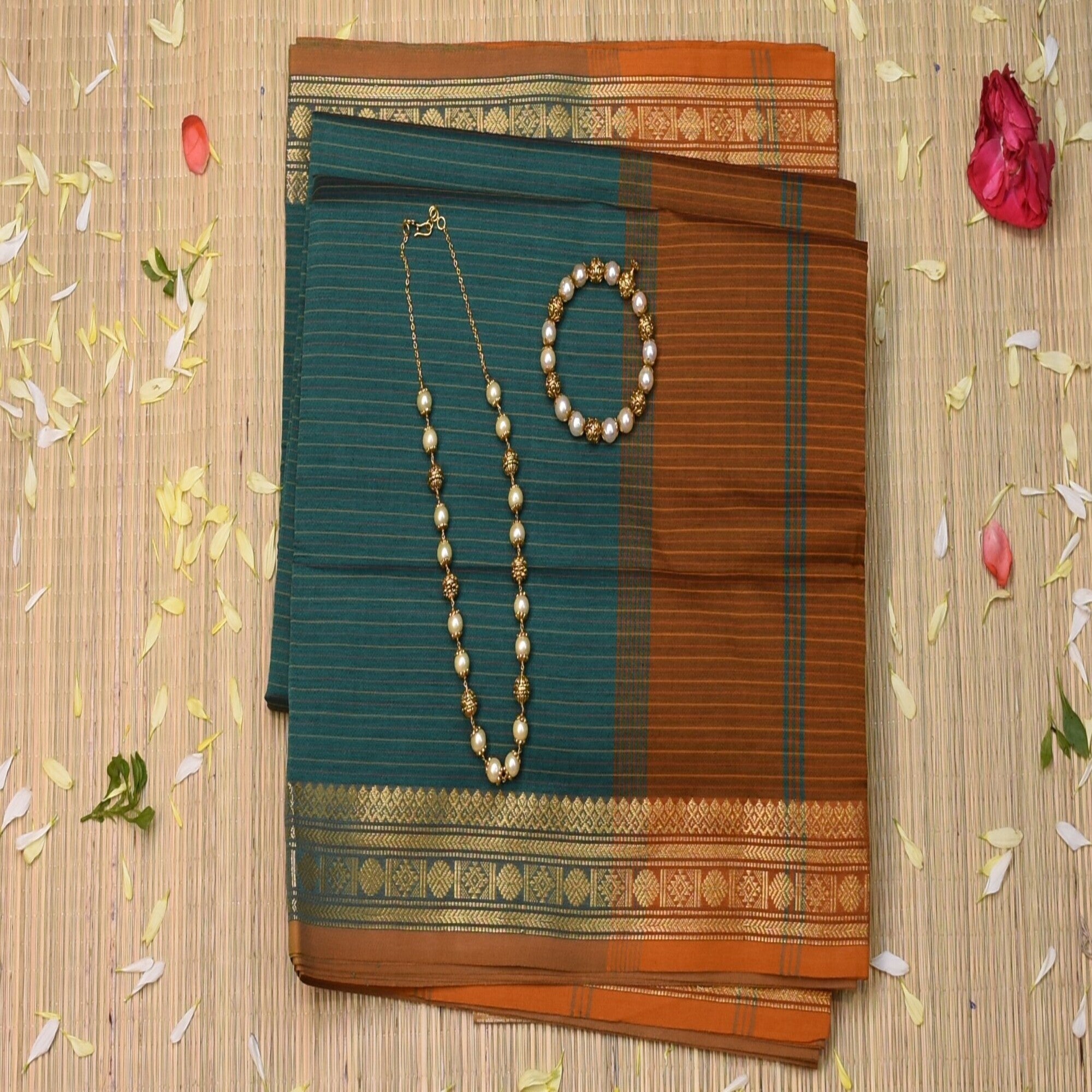This semi cotton rama green saree with brown boarder. The fabric breathes effortlessly while retaining a regal texture. This is perfect for pujas, casual wear and graceful day wear.