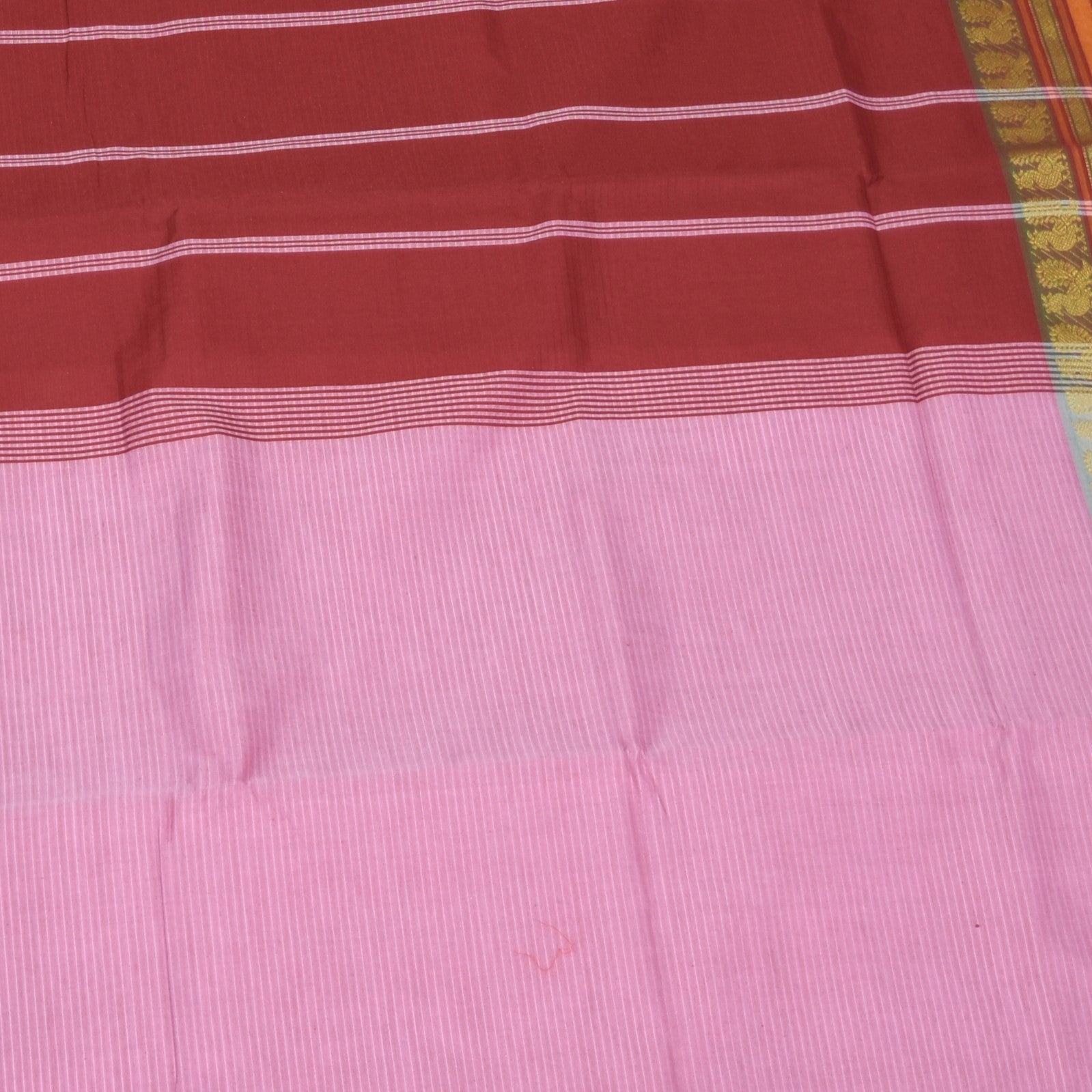 This semi silk cotton baby pink saree with Jari boarder. The fabric breathes effortlessly while retaining a regal texture. This is perfect for pujas, casual wear and graceful day wear.
