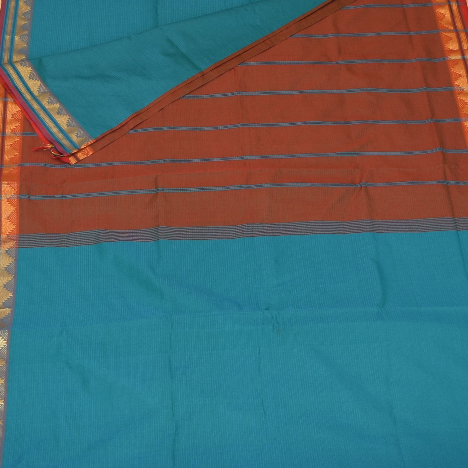 This semi silk cotton blue saree with Jari boarder. The fabric breathes effortlessly while retaining a regal texture. This is perfect for pujas, casual wear and graceful day wear.