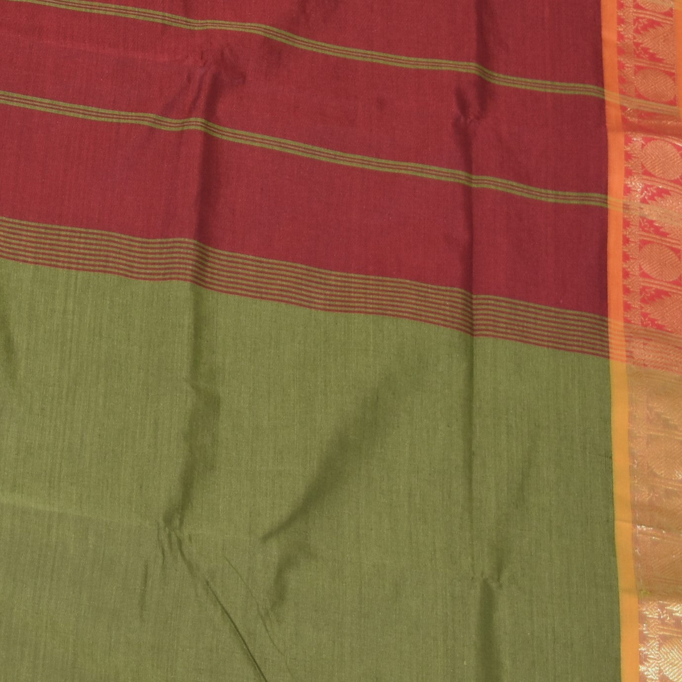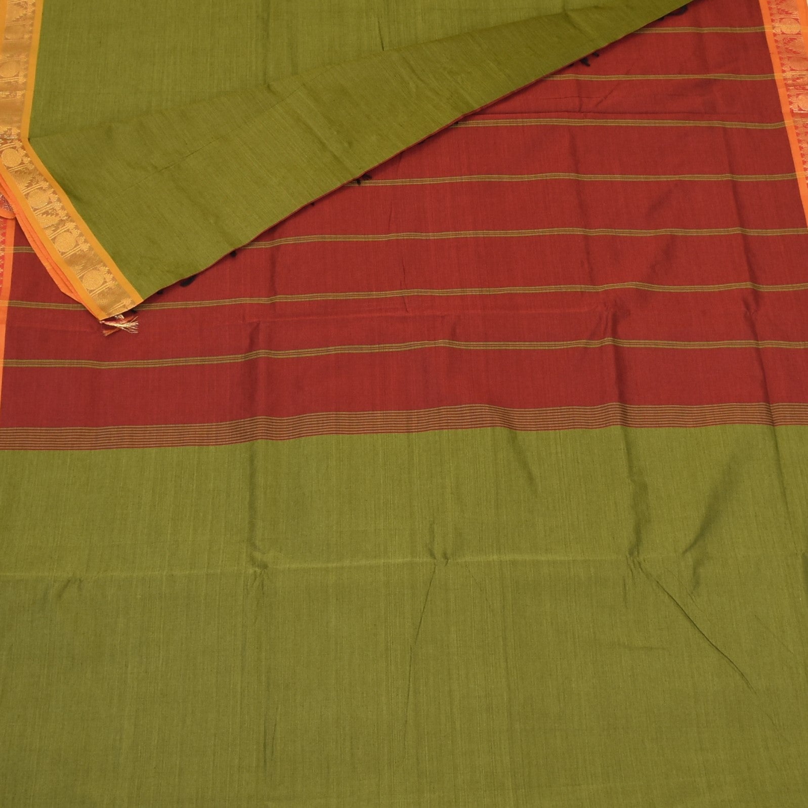 This semi silk cotton leaf green saree with Jari boarder. The fabric breathes effortlessly while retaining a regal texture. This is perfect for pujas, casual wear and graceful day wear.