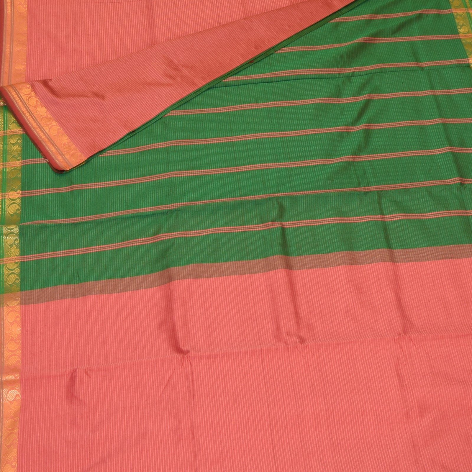 This semi silk cotton peach saree with Jari boarder. The fabric breathes effortlessly while retaining a regal texture. This is perfect for pujas, casual wear and graceful day wear.
