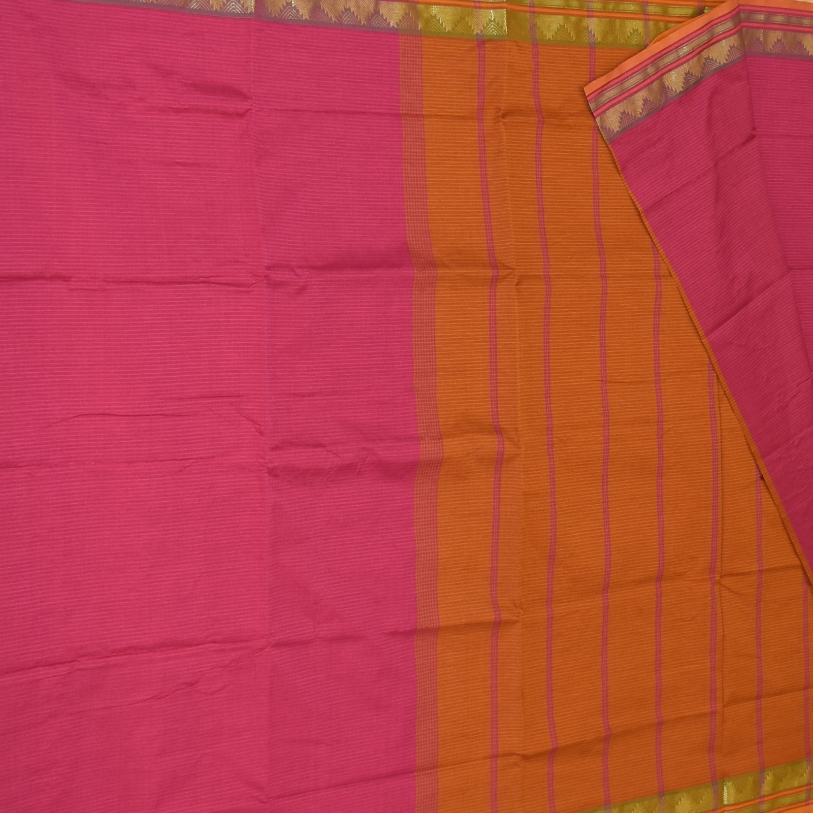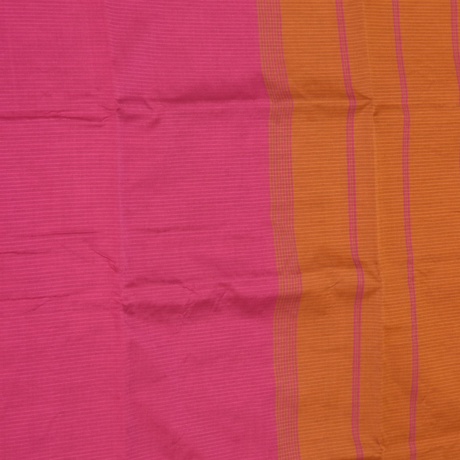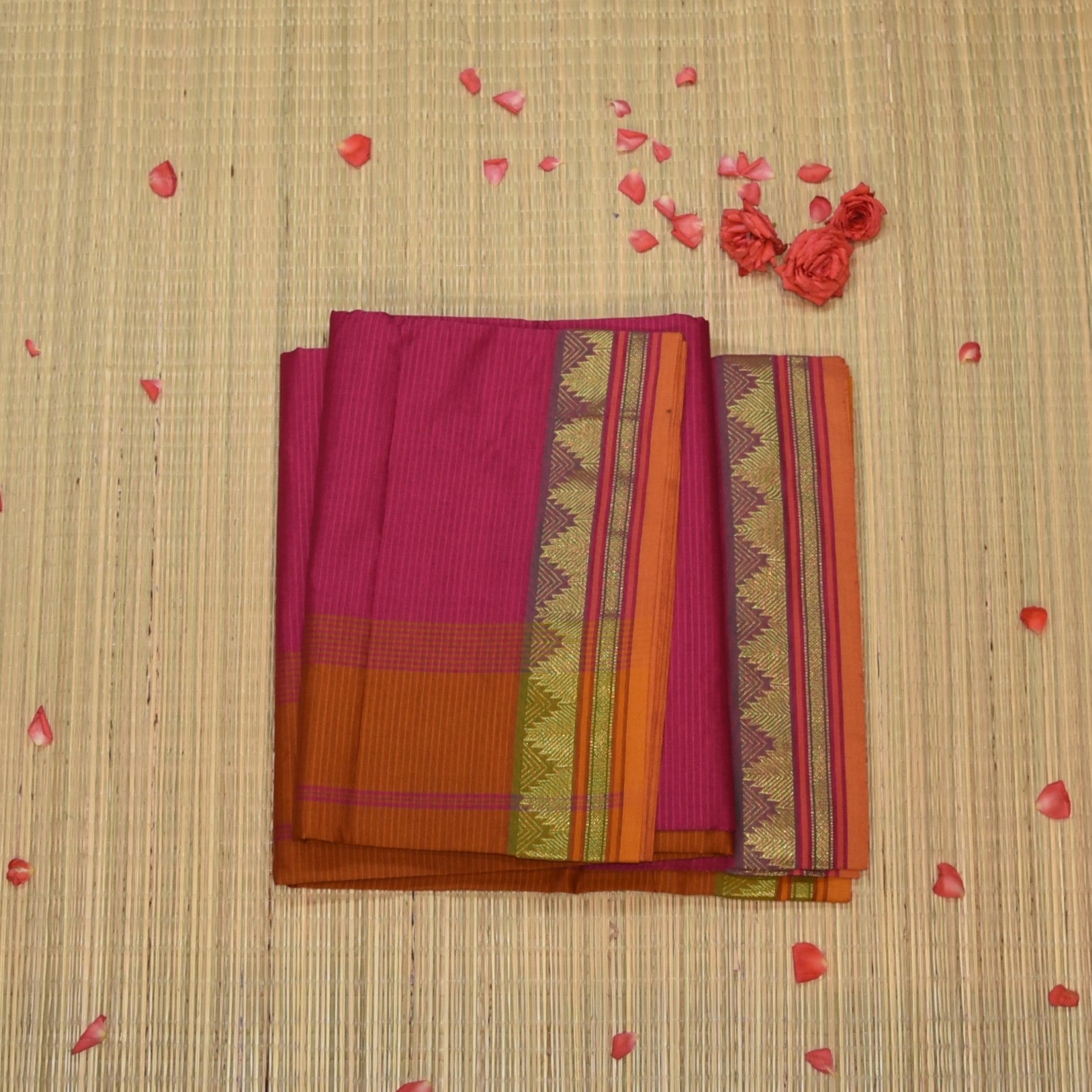 This semi silk cotton pink saree with Jari boarder. The fabric breathes effortlessly while retaining a regal texture. This is perfect for pujas, casual wear and graceful day wear.