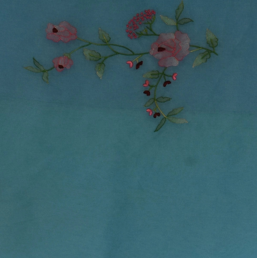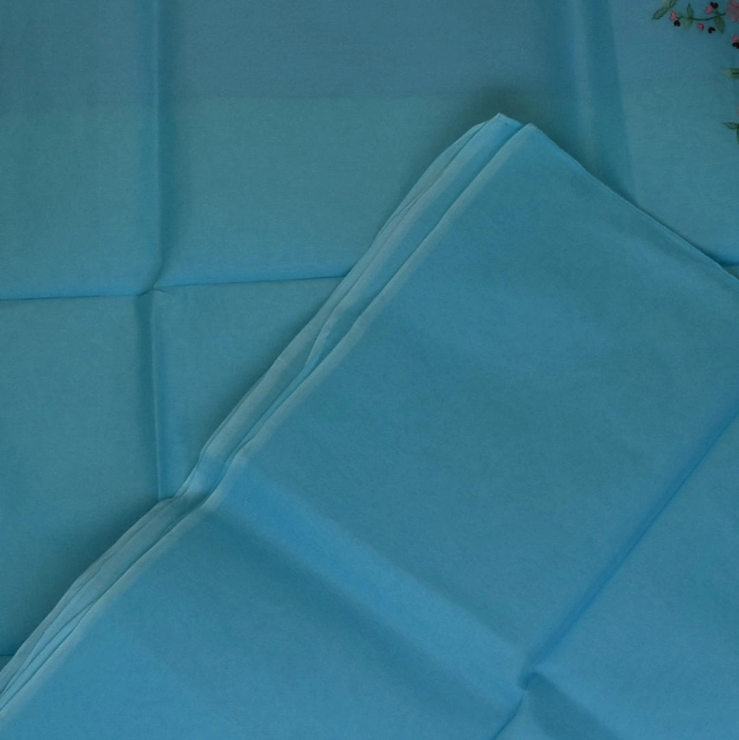 This organdy saree in a sky blue shade features elegant traditional patterns, perfect for graceful appearances and festive flair.