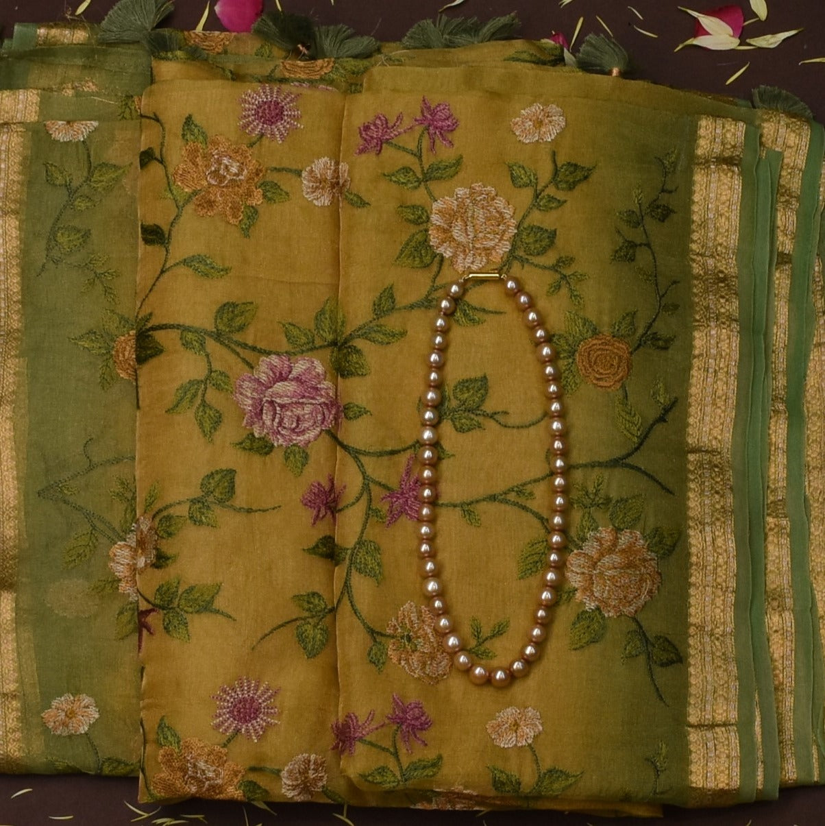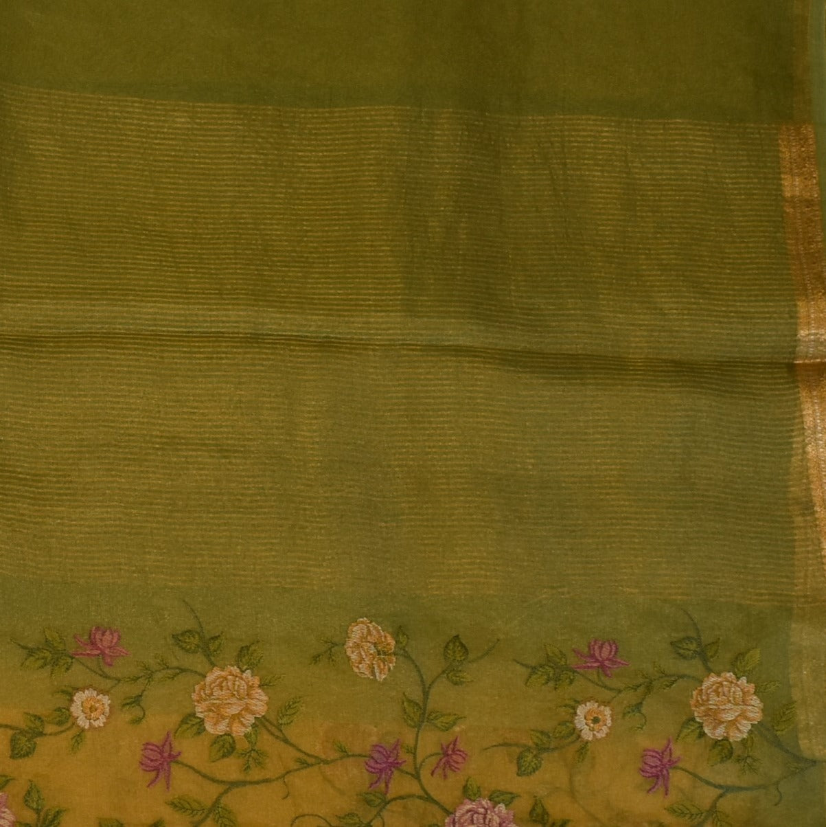 This Tissue saree in a olive khaki shade exudes grace and sophistication. Designed with intricate traditional motifs, it is perfect for weddings, festive celebrations, and cultural events.