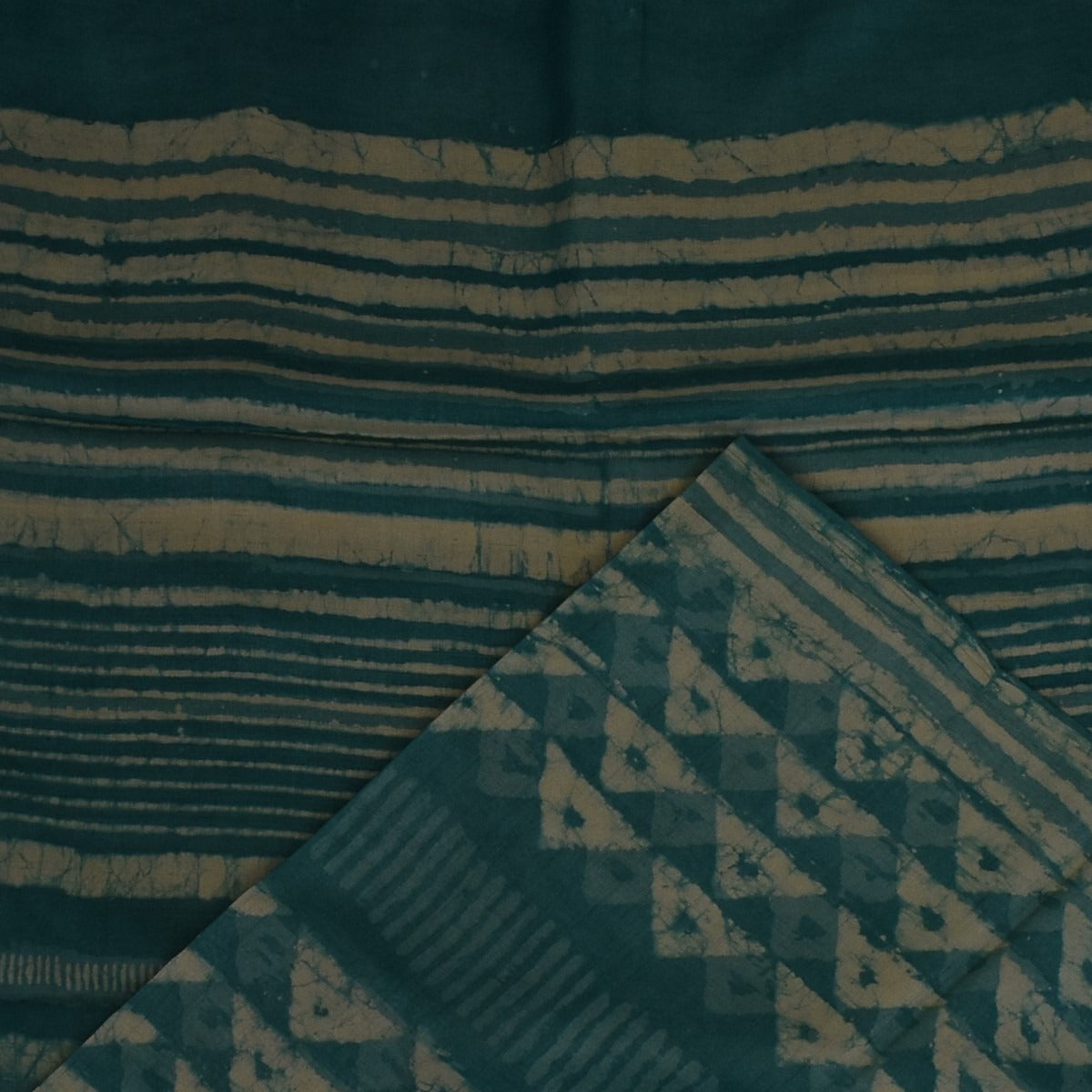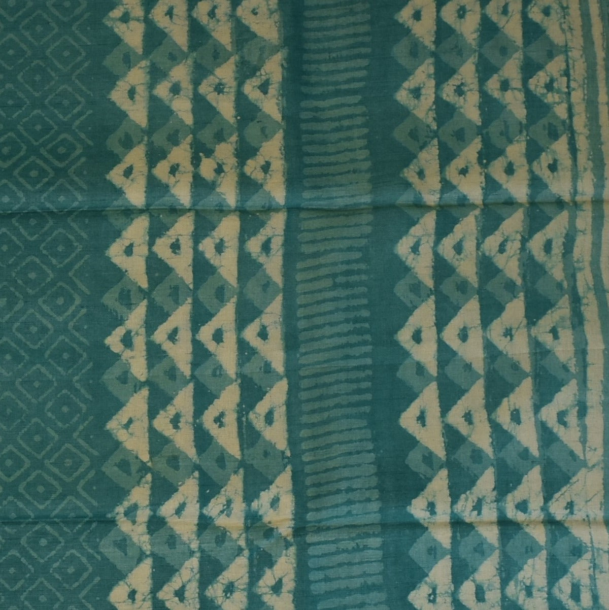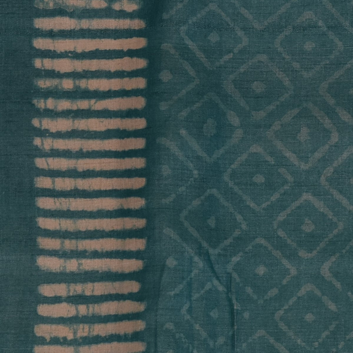 This Tussar block print saree in a teal tide shade exudes grace and sophistication. Designed with intricate traditional motifs, it is perfect for weddings, festive celebrations, and cultural events.