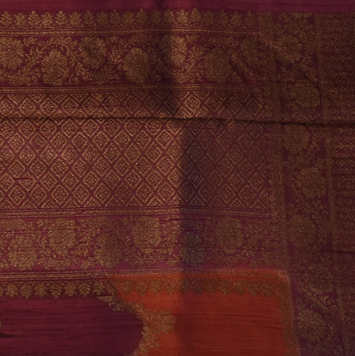 This Tussar Georgette saree in a scarlet flame shade exudes grace and sophistication. Designed with intricate traditional motifs, it is perfect for weddings, festive celebrations, and cultural events.