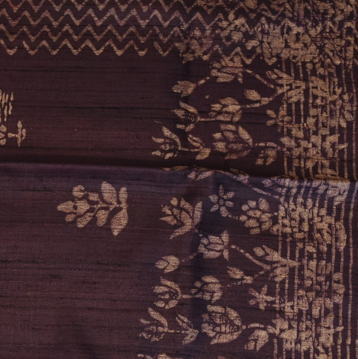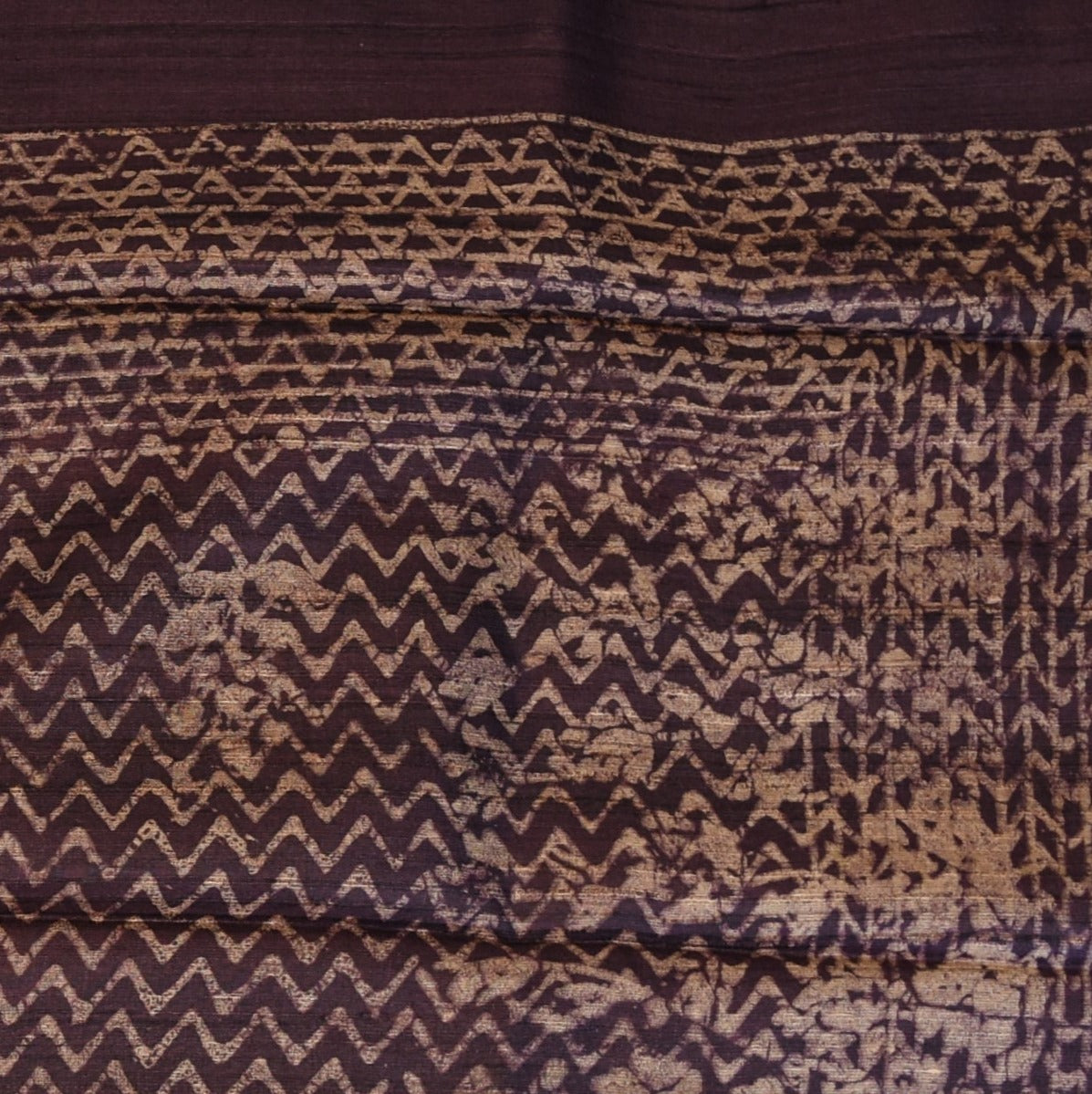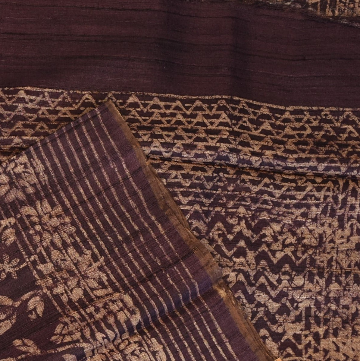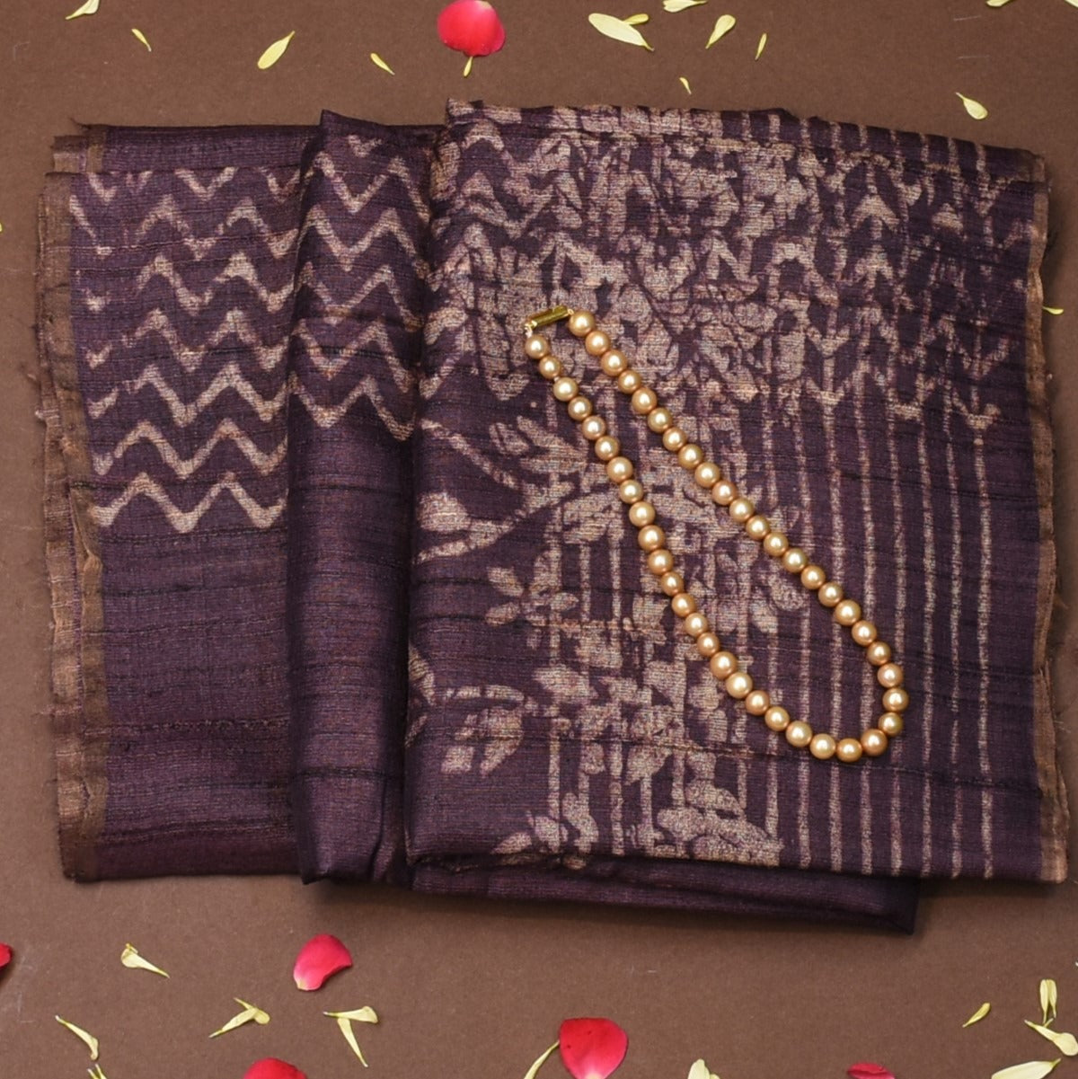 This Tussar Silk saree in a burgundy brown shade exudes grace and sophistication. Designed with intricate traditional motifs, it is perfect for weddings, festive celebrations, and cultural events.