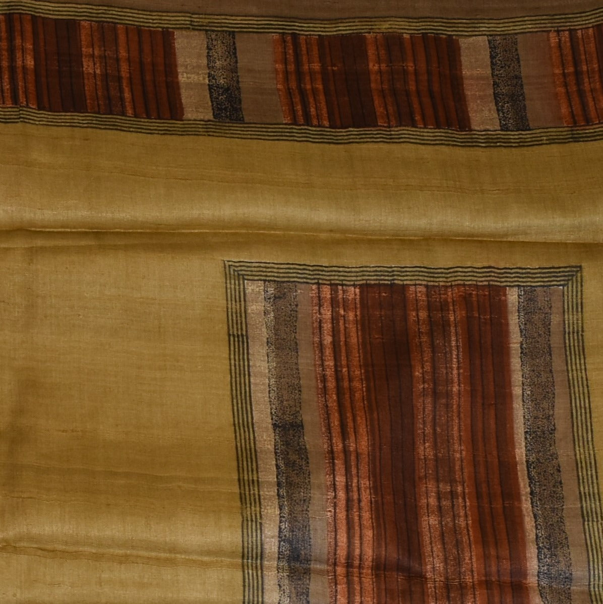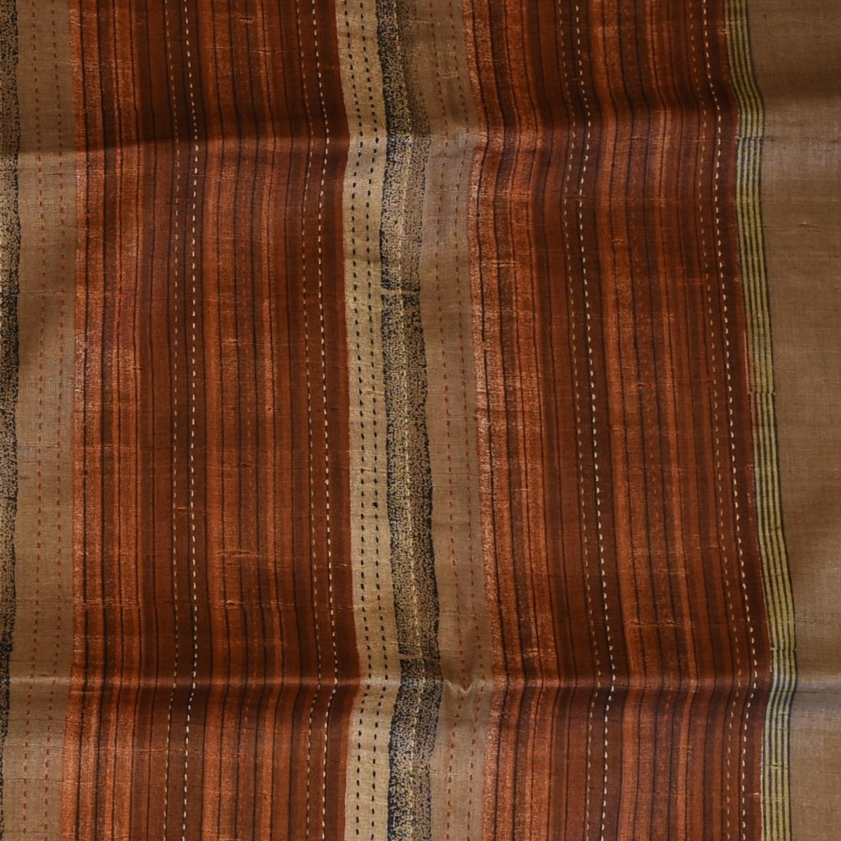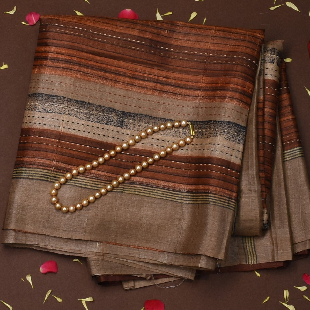 This Tussar Silk saree in a cinnamon brown shade exudes grace and sophistication. Designed with intricate traditional motifs, it is perfect for weddings, festive celebrations, and cultural events.