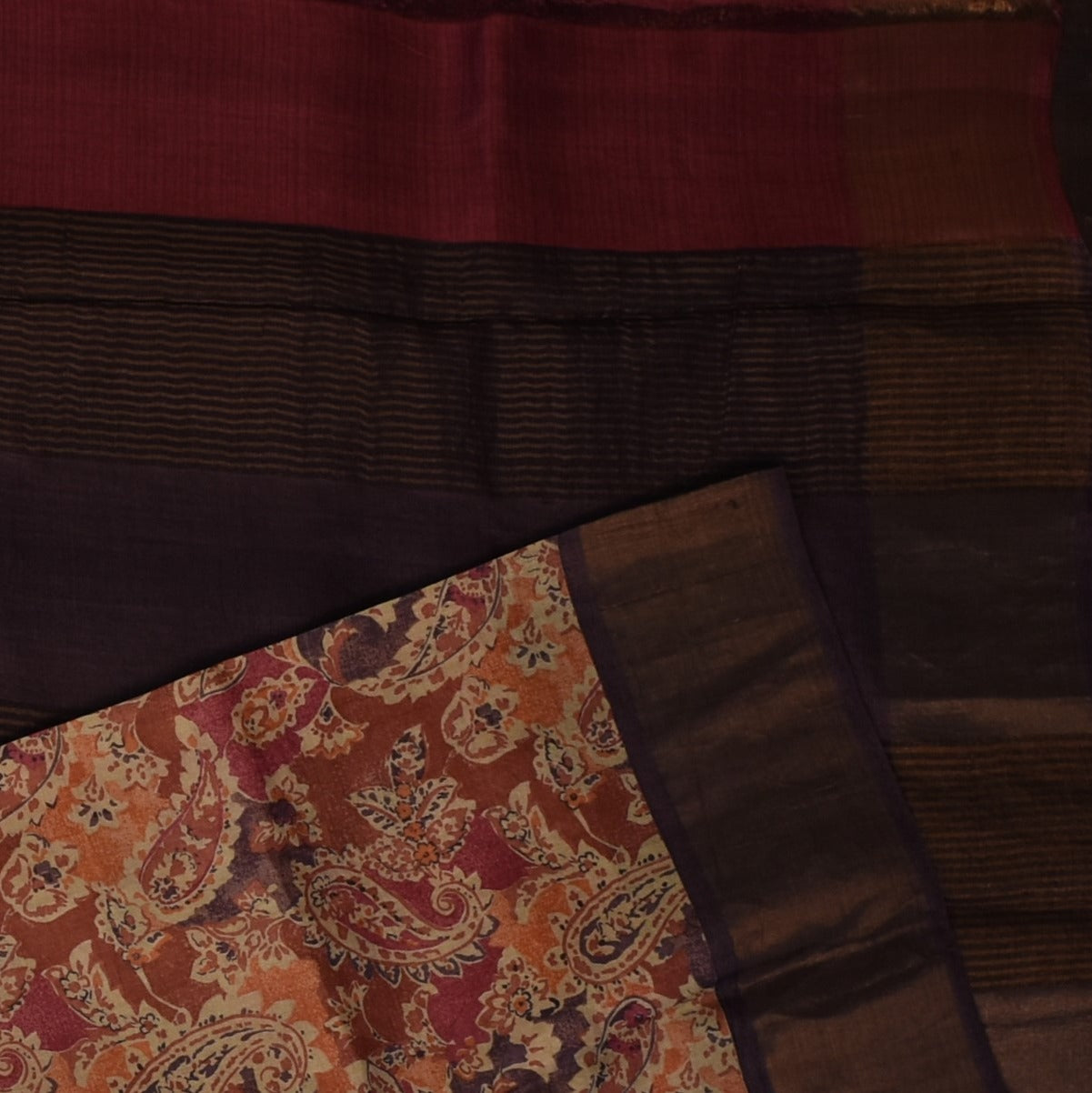 This Tussar Silk saree in a dusty rose shade exudes grace and sophistication. Designed with intricate traditional motifs, it is perfect for weddings, festive celebrations, and cultural events.