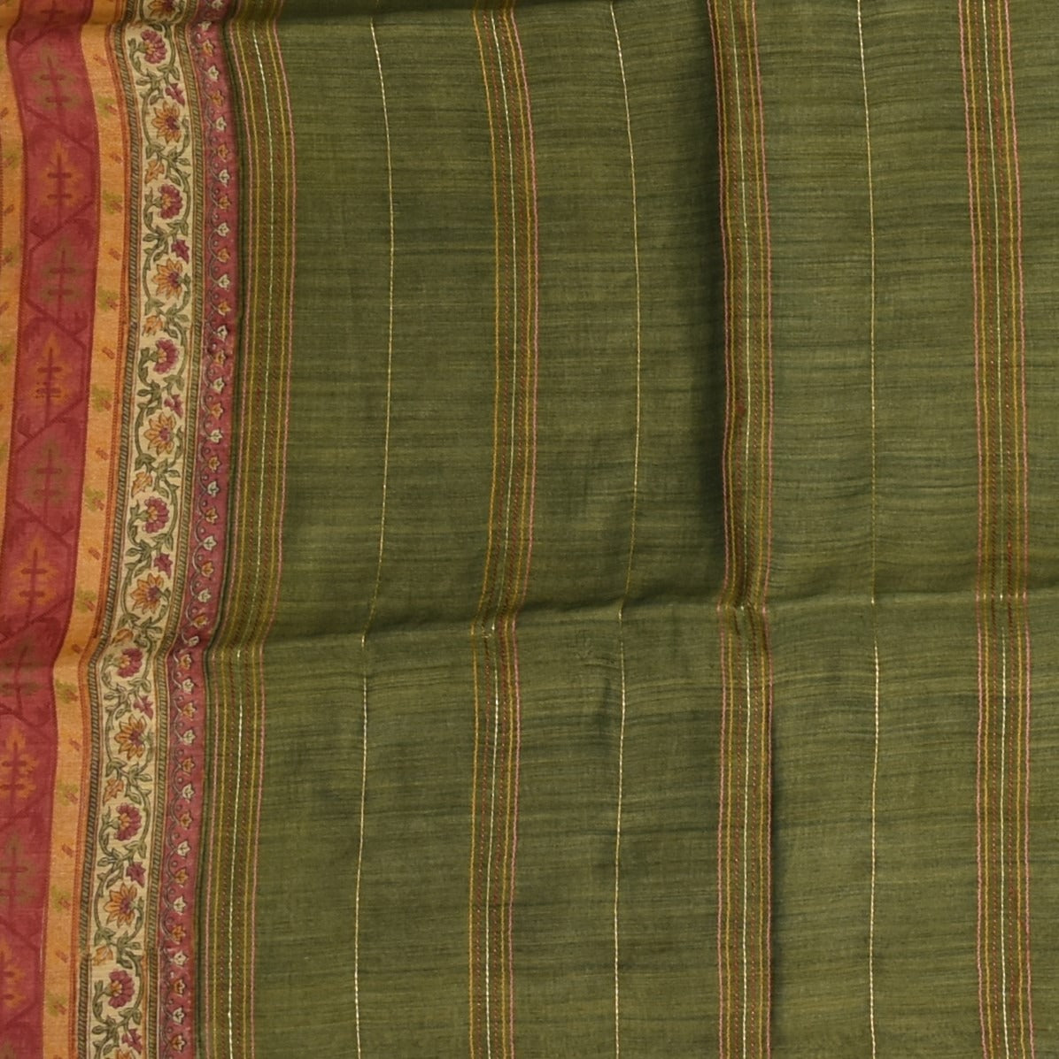 This Tussar Silk saree in a olive moss shade exudes grace and sophistication. Designed with intricate traditional motifs, it is perfect for weddings, festive celebrations, and cultural events.