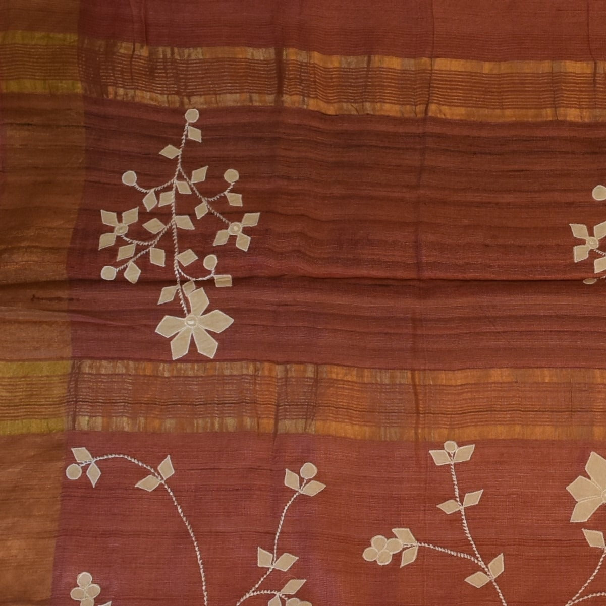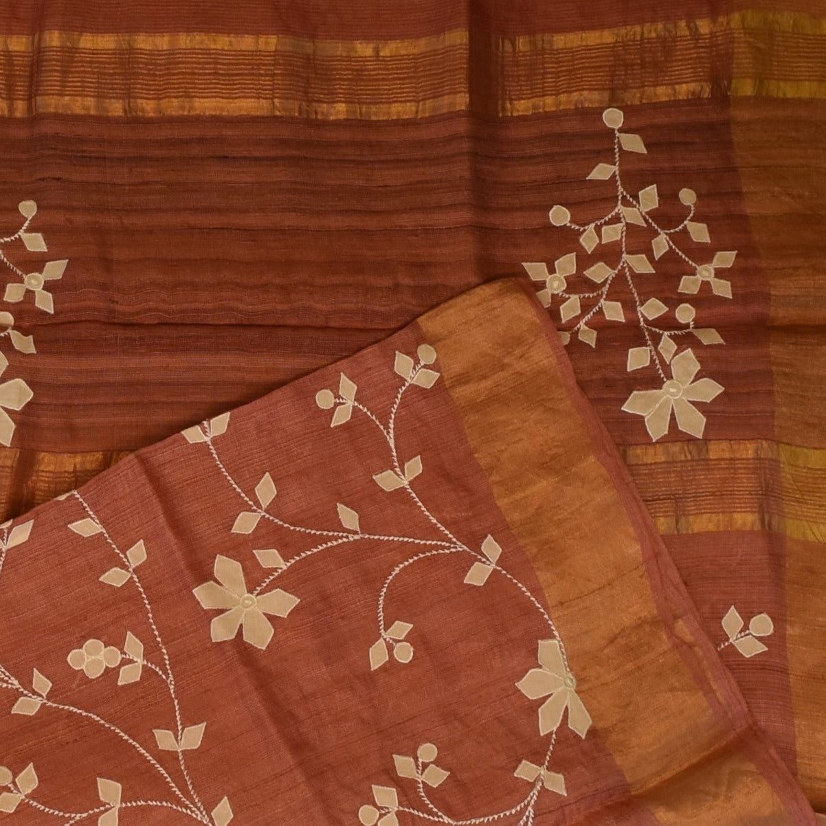 This Tussar Silk saree in a rust brown shade exudes grace and sophistication. Designed with intricate traditional motifs, it is perfect for weddings, festive celebrations, and cultural events.